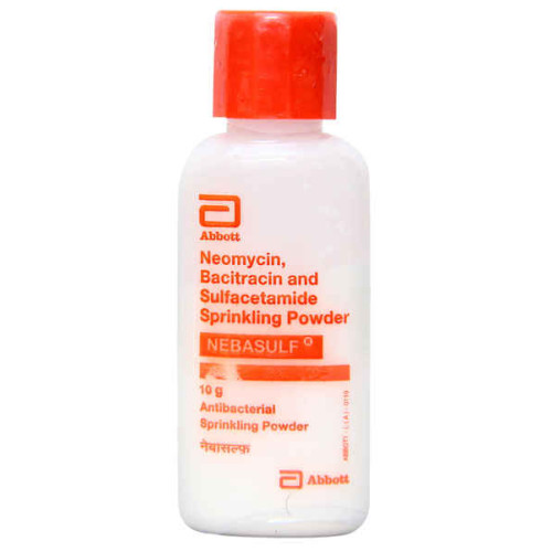 BENEFITNebasulf Sprinkling Powder 10 gm contains Neomycin, Bacitracin and Sulfacetamide used in the treatment of various bacterial infections of the skin associated with wounds, cuts, ulcers, burns and umbilical cord dressing. Neomycin and Sulfacetamide are effective against both gram-positive and gram-negative bacteria whereas Bacitracin is active against only gram-positive bacteria. Neomycin works by inhibiting the production of essential proteins that are necessary for bacteria to grow, multiply and increase in numbers. Thereby, destroys bacteria. Bacitracin works by inhibiting the formation of bacterial cell walls that are essential for their survival as they prevent the entry of unwanted substances into the cells and stops the leakage of cell contents. Sulfacetamide works by preventing the production of folic acid (a nutrient) by bacteria that is essential for multiplication of bacteria. Thereby, Nebasulf Sprinkling Powder 10 gm kills bacteria and clears the infection.